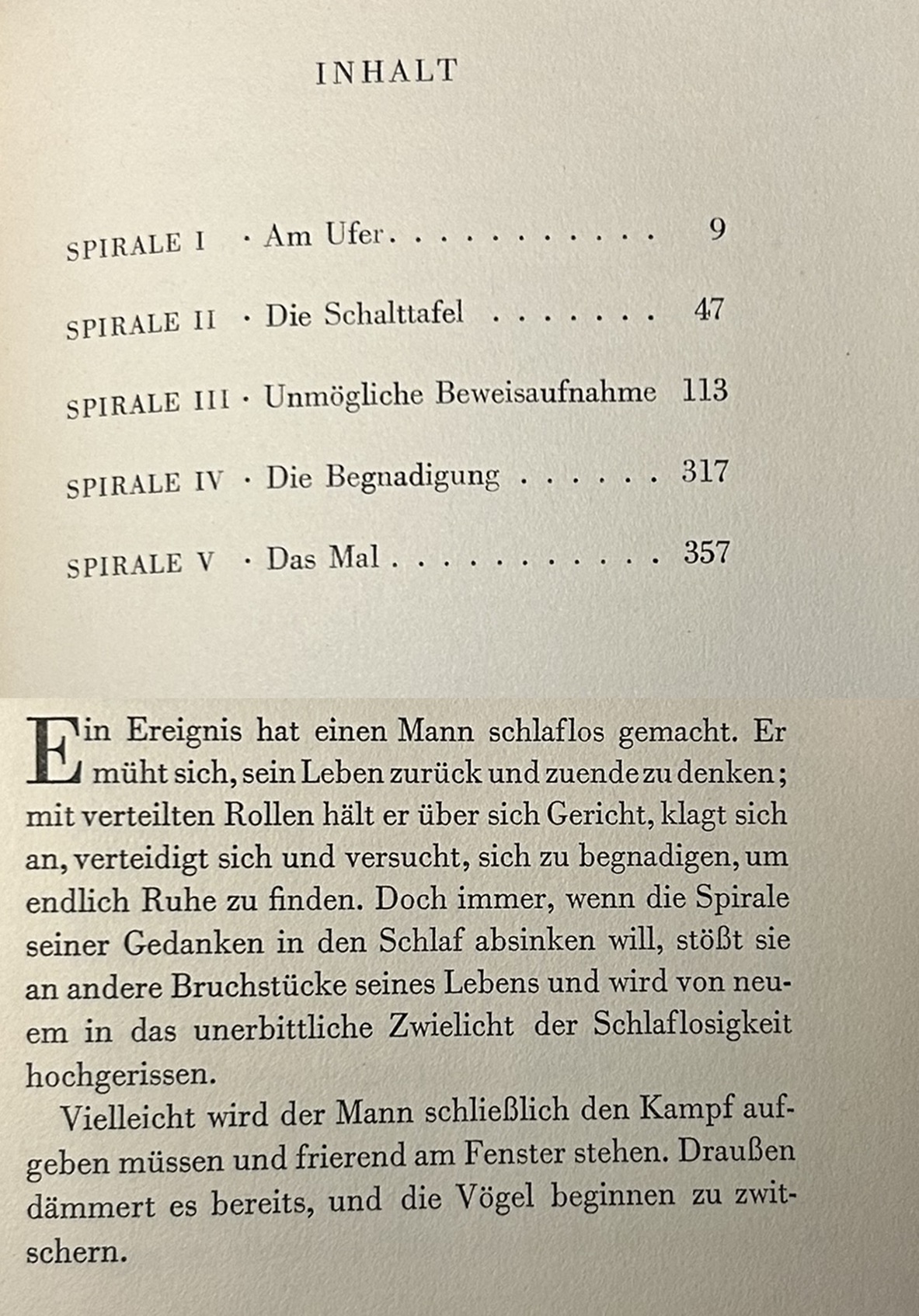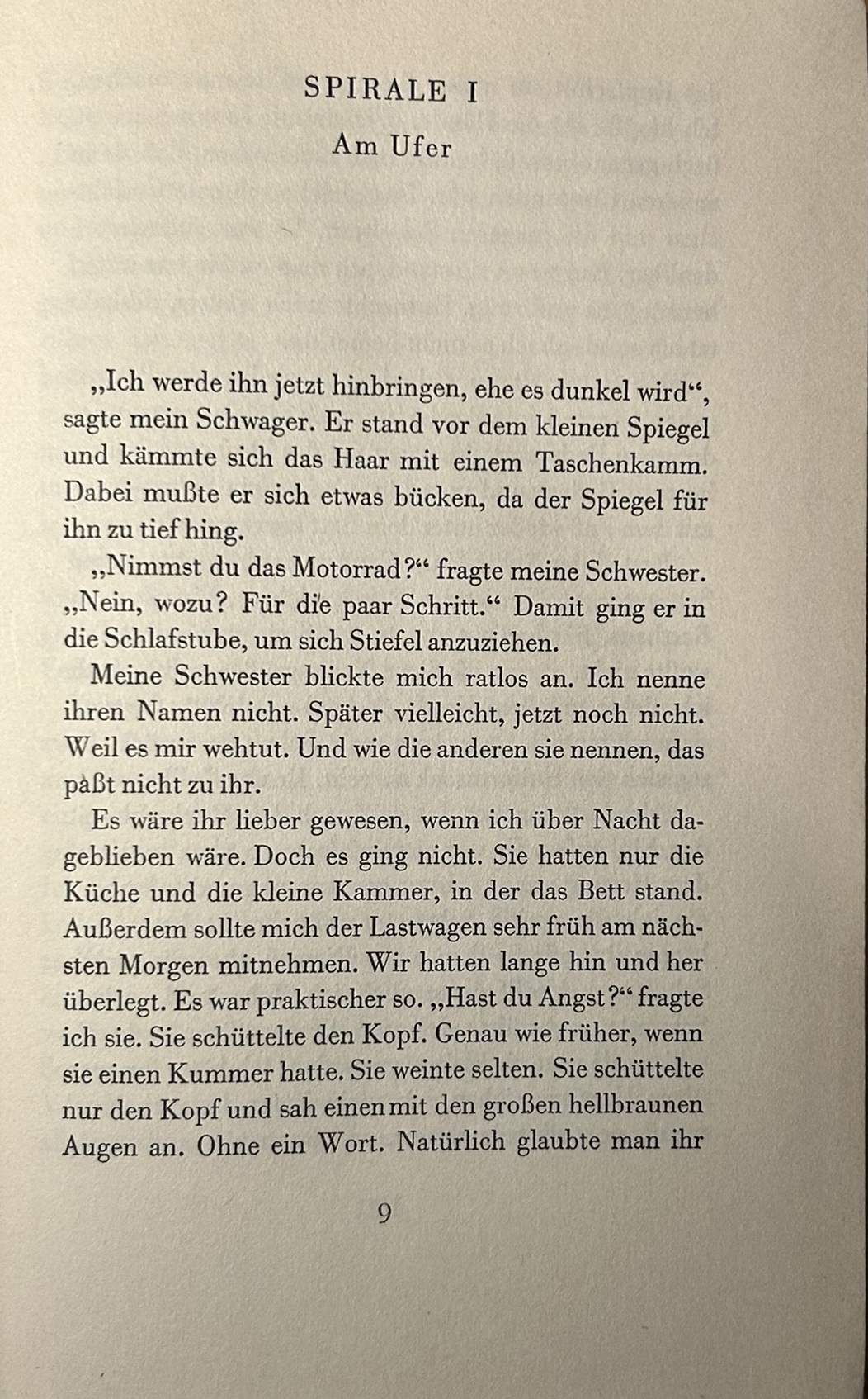 Die erste Spirale, „Am Ufer“, wird von einem jugendlichen Ich-Erzähler in Gang gesetzt, der sich,